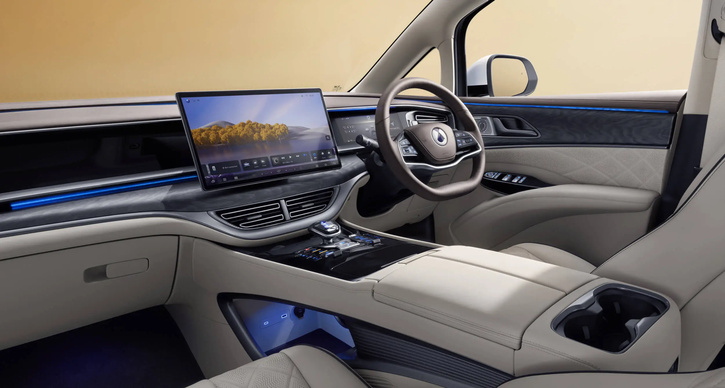 Dibuat dengan White Oak Trims dan Nappa Leather, interiornya memadukan keanggunan alami dengan kenyamanan mewah untuk pengalaman berkendara yang mewah.