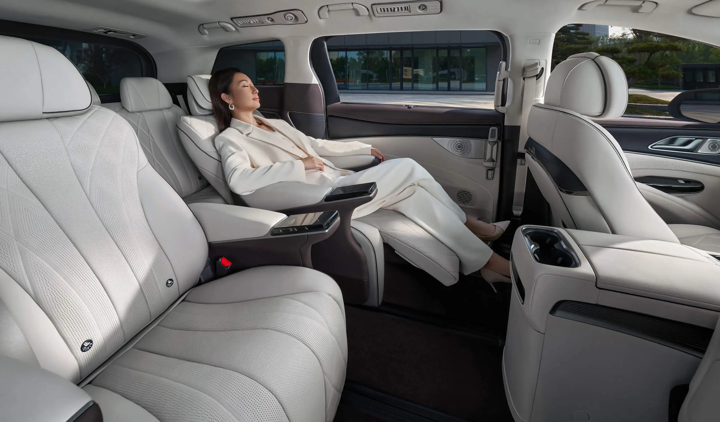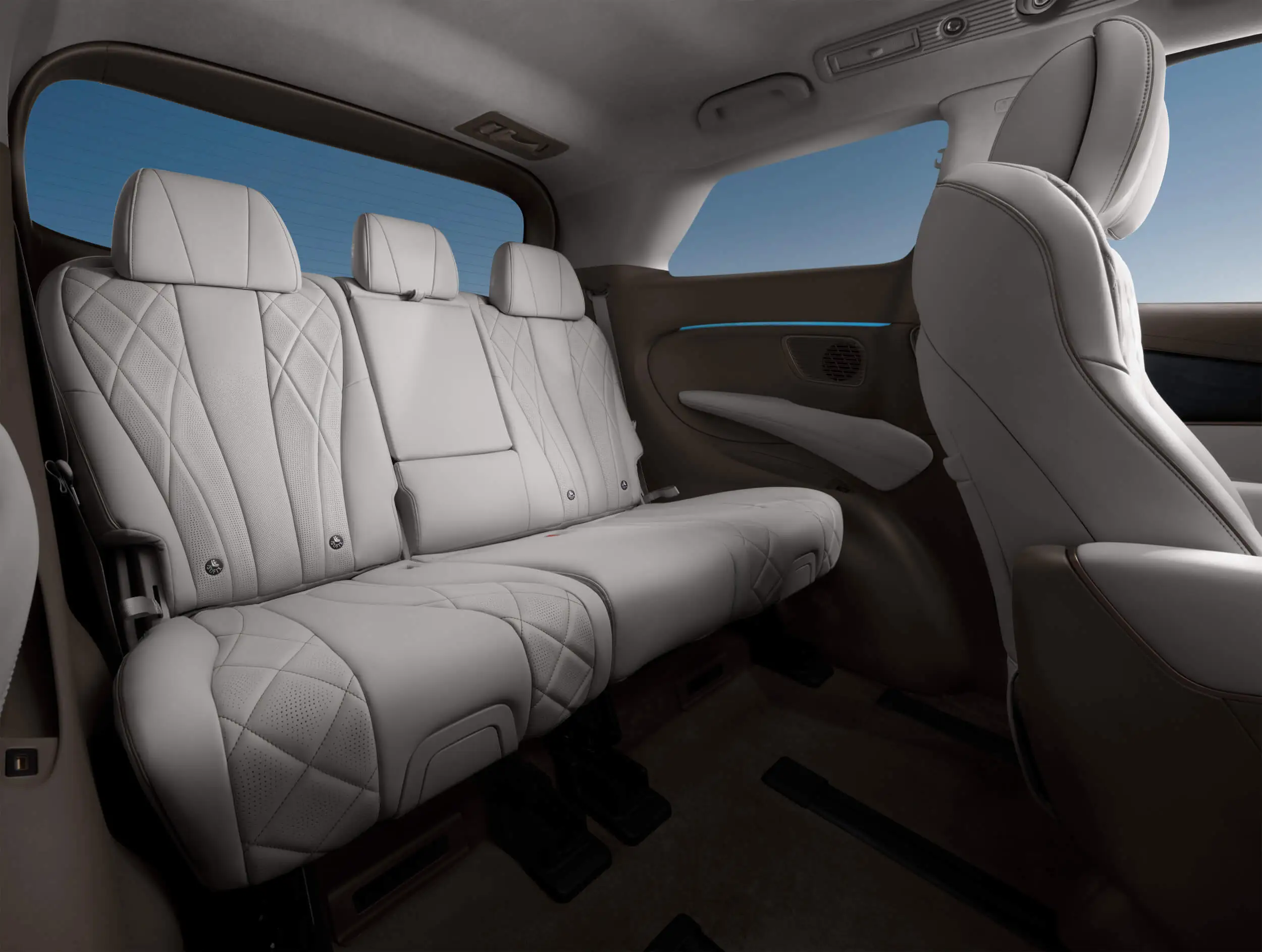 Nikmati kendali penuh dari kursi baris kedua dengan dual LCD di sandaran tengah untuk mengatur pijatan, musik, suhu kabin, pencahayaan, dan lebih lagi hanya dengan sentuhan.